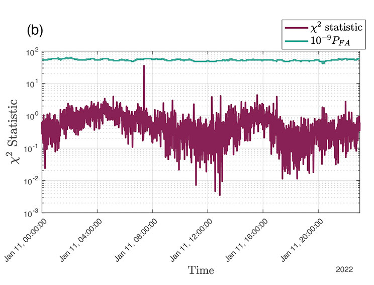 FIGURE 4b. GPS χ2 and probability of false alert (PFA) threshold for the nominal noise environments at CU Boulder. (Image: Authors)