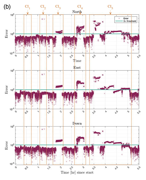 From the Galileo solution analysis, we increase our confidence that we have identified the regions with interference. We removed those areas and looked at the GPS vs. Galileo inter-constellation consistency difference. The normalized differences were now mostly within the 3σ threshold, and the raw error displayed some Gaussian behavior and is no longer on the order of the 105-meter error we were seeing in Figure 5. While these regions still have a higher error than nominal conditions and thus still display signs of interference, we are able to use our spoofing analysis to identify epochs in which we should not trust the GNSS. Using times outside those regions, we are able to figure out a reasonable truth position within 20 meters rather than 200 kilometers.