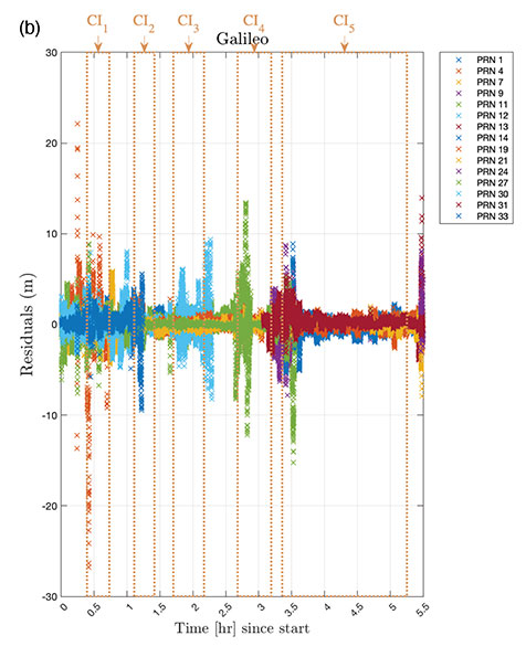 FIGURE 6b. Galileo pseudorange residuals for position solutions computed using only the Galileo constellation for the DHS-sanctioned RFI testing event. (Image: Authors)