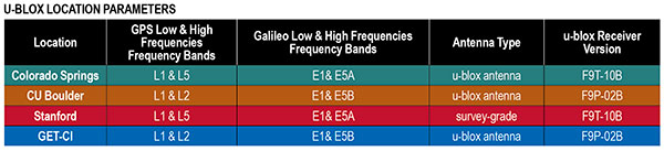 To characterize nominal noise environments, u-blox receivers were set up at three locations: Stanford University, the University of Colorado (CU) in Boulder, and at the Colorado Springs airport. All measurements from satellites below an elevation angle of 5 degrees were ignored. The results from these locations are summarized below. Results from a jamming/spoofing test sanctioned by the U.S. Department of Homeland Security are presented and labeled with the acronym “GET-CI” (GPS Testing for Critical Infrastructures) in the subsequent discussion. Table 1 describes the parameters of the u-blox receiver at each location.