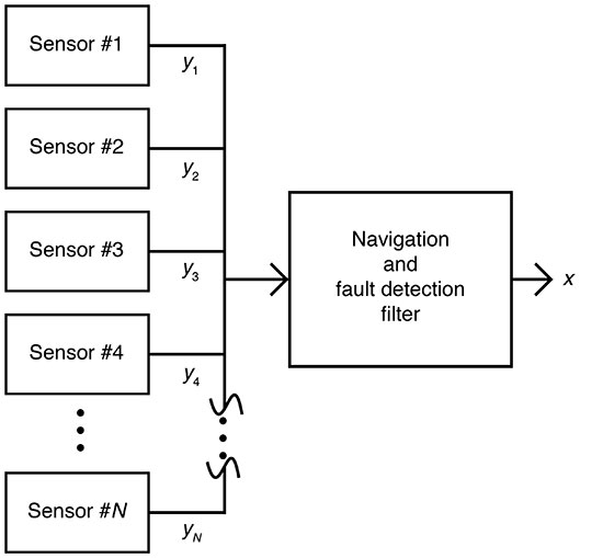 To understand parallel filtering, consider the schematic in FIGURE 1, which represents the conventional way in which an integrated navigation system fuses the information from N sensors. All the measurements from the N sensors are integrated in a single sensor-fusion algorithm. In the context of what we are describing here, the algorithm consists of a navigation filter and a fault-detection filter. The sensor-fusion algorithm integrates the measurements from all N sensors and generates a single, optimal estimate of the navigation state vector.
