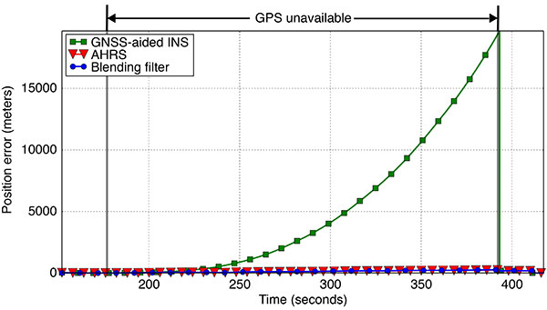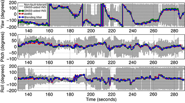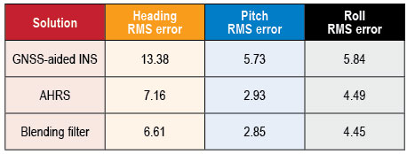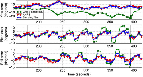 FIGURE 5 shows the errors in the attitude of all three filters during this flight test. It shows that the blended estimates of heading, pitch and roll tend to oscillate closer to zero error than either of the individual filters themselves. This is reflected in TABLE 1, where it can be noted that the root-mean-square (RMS) error of the blended solution is lower than either the GNSS-aided INS or the AHRS in each of the three attitude solutions.