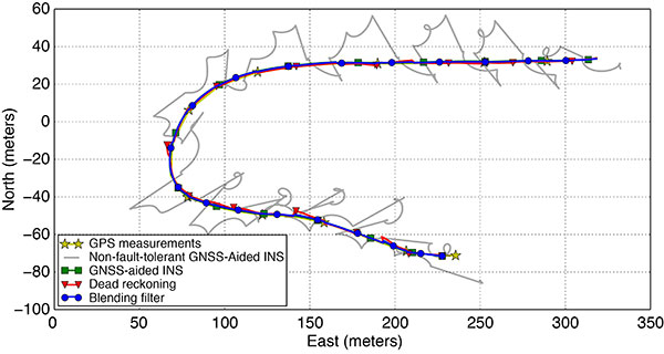 The dark traces in Figure 10 show the performance of the fault detection and isolation algorithm paired with the parallel filtering scheme described in this article. It is seen to be fault-tolerant and ignores the invalid measurements. Although nearly no aiding was provided until after the GPS sensor converged back to a stable state, the fault tolerant filter provided a much more accurate solution.