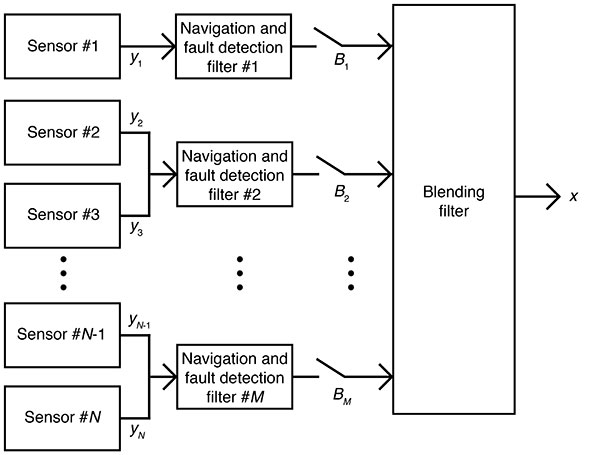 where Bj are blending weights that function as switches, which can be “opened” (set to zero) to isolate a parallel filter momentarily or permanently when a failed sensor is detected. The analogy with a physical switch should not be taken literally, however, because they are not “hard on-off” switches. Instead, they are matrices, which serve to change the emphasis put on a particular parallel filter. The blending weights are calculated so that the estimate Inn-x is an unbiased minimum-variance estimate. In mathematical terms, this means that they minimize the trace of the final covariance P. We will give more detail on how to calculate the weights shortly, but before we do that, let us describe, at a high level, how all of this works.
