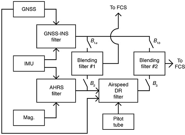 The measurements from the sensors in the jth cluster is processed in a sensor-fusion algorithm to generate an estimate of the state vector denoted xj and a covariance matrix Pj. Each pair (xj, Pj) is then sent to a blending filter that generates a single optimal estimate Inn-x and P. The estimate  is a weighted sum of the estimates from the M filters: