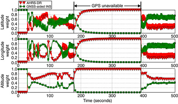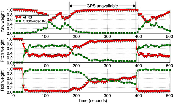 The INS exhibits extreme drift errors after only three minutes of unaided operation. The blending algorithm detects this inaccuracy and places more weight on the slow-drifting AHRS-DR solution, as shown in Figure 8. When GPS services are restored, the GNSS-aided INS error is “reset,” and the position weights are re-established to their pre-outage levels with minimal transient responses.