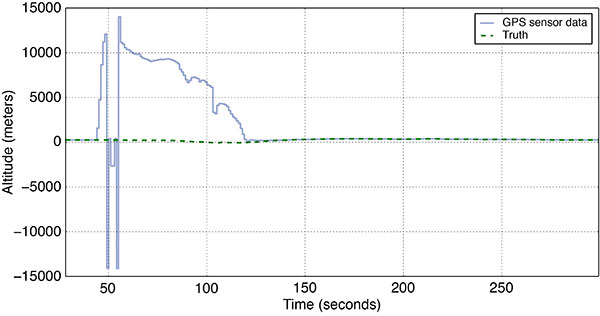 We next show data from another flight test where an unplanned but fortuitous fault in the GPS sensor occurred. The cause of this fault has not been definitively determined, but potential reasons for it include loose cabling or outdated firmware. Nevertheless, this fault provided useful flight data for our architecture as no fictitious or simulated data was used. FIGURE 9 shows the GPS altitude measurements during this flight test. At t = 44 seconds a large oscillatory GPS error occurred. Similar errors were present in the GPS measurements of the velocities, latitude and longitude.