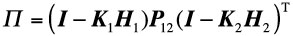 where P12 is the cross-correlation between the states of parallel filter #1 and #2. We will say more about this shortly. In the meantime, note that in Equation (9), P1 and P2 are the covariances computed by the parallel filters after the measurement update. This computation requires knowledge of K1 and K2, which are the EKF gains for parallel filters. The matrices H1 and H2 are the observation matrices for filters #1 and #2. They relate the measurements y1 and y2 of the two parallel filters to their respective state vectors as follows (refer to Figure 2):