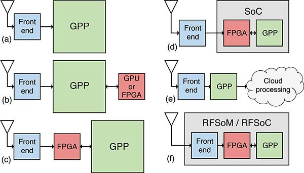 A similar architecture can be achieved using modern system-on-chip (SoC) integrated circuits (ICs), which can offer a large FPGA and a powerful GPP on the same piece of silicon, as depicted in Figure 1 (d). Indeed, a number of receivers using this architecture have seen commercial and scientific success, having many of the benefits of dedicated silicon while retaining the benefits of the software-defined radio (for example, the Swift Navigation Piksi Multi GNSS Module). Recent developments in the field have seen the world’s first RF system-on-module (RFSoM) or system-on-chip (RFSoC) devices, targeting 5G mobile communications applications. With an architecture similar to that of Figure 1(f), the IC touts up to eight inputs and eight outputs (8×8) multiple input, multiple output (MIMO) with 12-bit analog-to-digital converters (ADCs) and digital-to-analog converters (DACs) running at rates of 2/4 gigasamples per second. Depending on how this trend evolves (assuming lighter versions become available), this might offer an exciting new platform for GNSS SDRs, simultaneously capable of multi-frequency and multi-antenna operation.