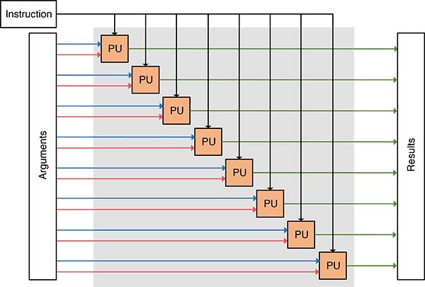 In combination with task parallelization, software-defined receivers can still resort to another form of parallelization: instructions that can be applied to multiple data elements at the same time, thus exploiting data parallelism. This computer architecture is known as Single Instruction Multiple Data (SIMD), where a single operation is executed in one step on a vector of data, as illustrated in FIGURE 3.