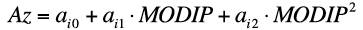 The NeQuick model has been adapted for Galileo single-frequency ionospheric corrections (for convenience, the Galileo version is known as NeQuick G) in order to derive real-time predictions based a single input parameter, Az, which is determined using three coefficients broadcast in the navigation message. The three coefficients are used in a second-degree polynomial as a function of the modified dip latitude (MODIP) of the receiver, to determine Az, which replaces the solar flux input parameter of the parent NeQuick model, with the following equation: