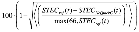 where STECref is the reference STEC and STECNeQuickG is the STEC obtained with the Galileo correction model. The factor 66 is used to avoid the fact that small absolute errors, which are relatively large due to small reference values, inflate the correction capability; it is linked to a target correction of 70 percent with a minimum absolute threshold of 20 TECU (30 percent of 66 TECU is about 20 TECU).