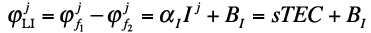 where LI represents the linear combination between signals at frequencies f1 and f2INN-E3a is the ionospheric delay in meters of LI; and BI is composed of several terms: station and satellite phase inter-frequency biases (INN-KLI and INN-KLIJ respectively), LI phase ambiguity (λ1N1jλ2N2j), phase wind-up, multipath, and noise. And i corresponds to the station and j to the satellite.