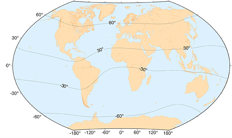 FIGURE 2. MODIP regions. Contours are modified dip latitudes.