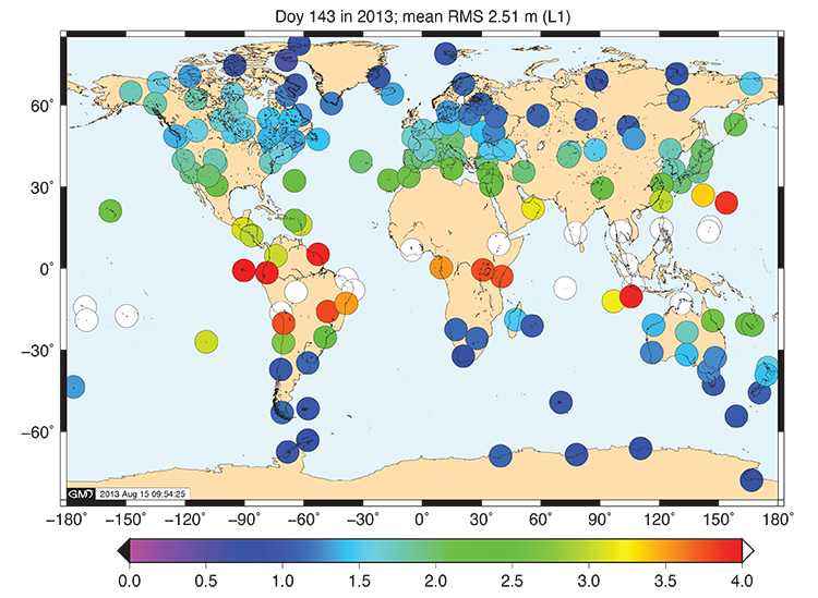 • The root-mean-square (RMS) error of the ionospheric model in meters of L1 code delay, for one station and one day.