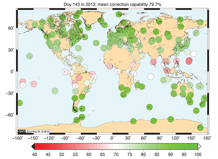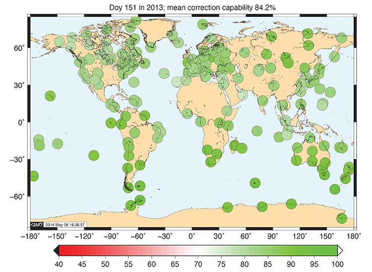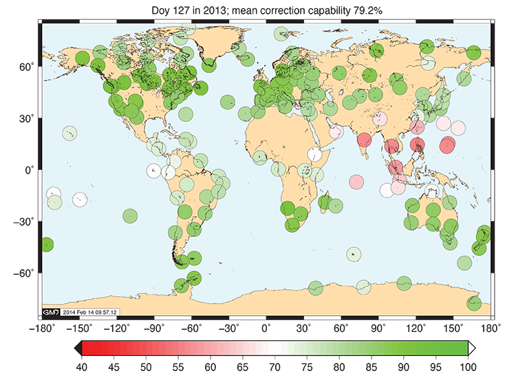 The first analysis that we performed was the daily RMS error and correction capability for all stations. Most days have shown very promising performance. To see different levels of performance, results for one “bad” day and one typical “good” day, in the period of experimentation, are presented in FIGURE 3. It is observed that even for the “bad” day, the correction capability is above 70 percent, except for some stations in the equatorial regions. This performance is exceeded significantly for the “good” day, with RMS residual ionospheric errors below 1.5 meters for L1 even at low latitudes.