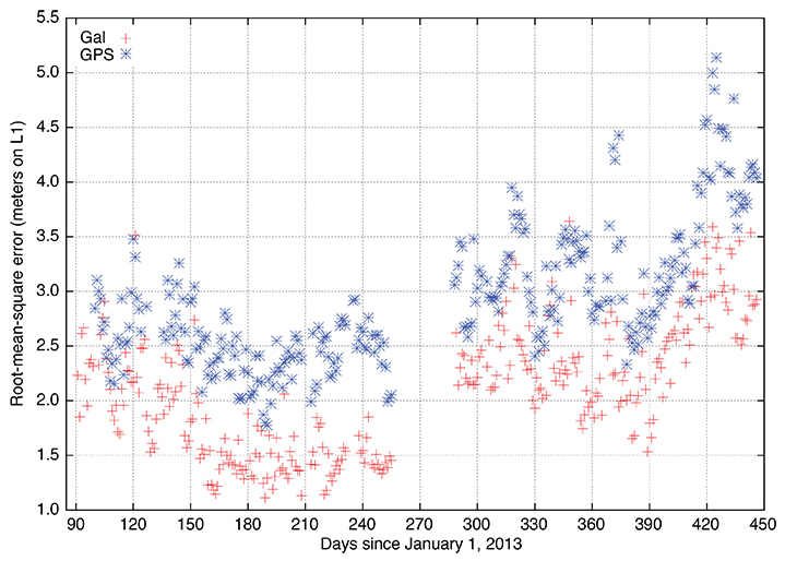 The first two In-Orbit Validation (IOV) satellites were launched by a single rocket on October 21, 2011, and the third and fourth IOV satellites were similarly launched on October 12, 2012. The two GIOVE satellites and first two IOV satellites provided an opportunity to use Galileo-only receiver measurements and after-the-fact precise satellite orbit and clock data to compute the position of a receiver’s antenna. Joined by two colleagues, I was pleased to report our successful attempt using dual-frequency carrier-phase and pseudorange data collected on May 17, 2012, in an article in the September 2012 issue of this magazine. The two GIOVE satellites were subsequently retired.