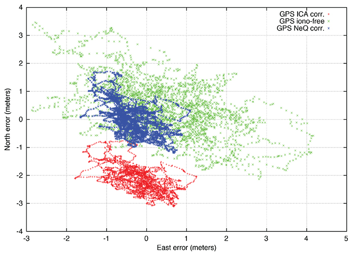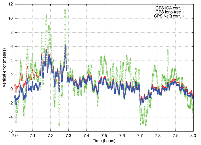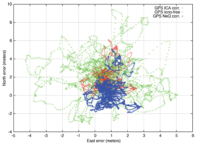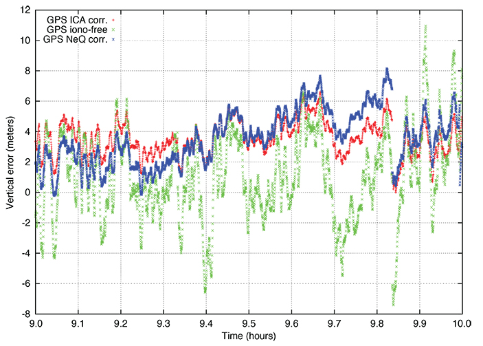 Effect in the Positioning Domain. We have performed two analyses to assess the correction performance in the positioning domain: one using GPS observables and one with Galileo-only observables. In both cases, we used three ionospheric delay mitigation methods: the dual-frequency ionosphere-free combination, the single-frequency GPS ICA correction algorithm, and the single-frequency Galileo NeQuick G correction algorithm.