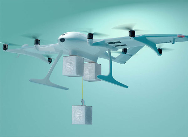 The vertical-take-off-and-landing (VTOL) delivery drone has a triple-drop winch mechanism that allows for delivery of up to three packages per flight. The UAV takes off and lands vertically, thanks to its tilt-rotor design, and can carry a payload of up to 13 pounds. It can travel up to 47 miles on one electrical charge at up to 93 mph; with fewer packages, a range of up to 68 miles may be possible.