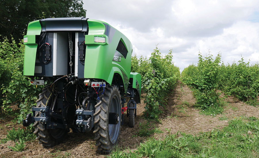 The Trektor hybrid robot for agriculture, made by the French company SITIA, can work on a variety of crops by changing the width of its wheelbase and can perform many repetitive tasks, such as spraying and hoeing. (Image: SITIA)