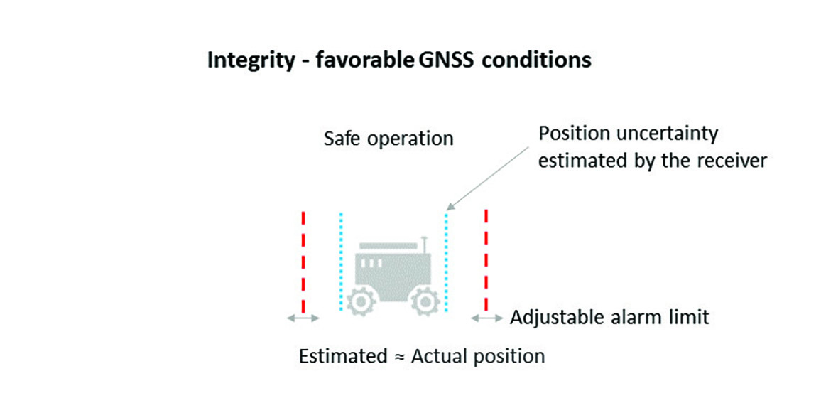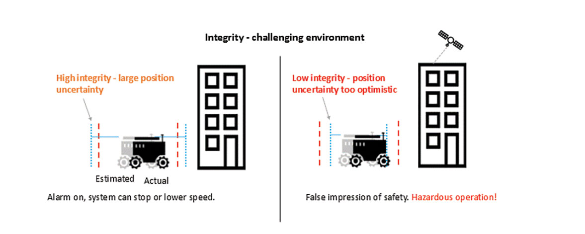 A low integrity receiver may keep reporting an optimistic positioning uncertainty, that stays below the preset alarm limit even when the calculated position is way off from the actual position. The number may look fine, but effectively it becomes a “robot on the loose,” no longer on its planned path with a risk of damaging itself and its surroundings.