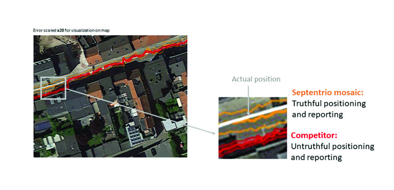 Figure 3. In an urban canyon car test the Septentrio receiver reports truthful position uncertainty. A competitor receiver seems to be more accurate, while the actual position is not even within its reported uncertainty boundaries. (Image: Septentrio)