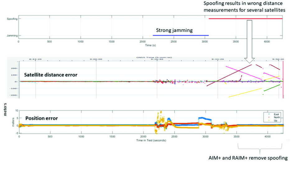 The diagram in Figure 4 shows RAIM+ in action during a jamming and spoofing attack on a Septentrio GNSS receiver. While AIM+ removes the effects of GNSS jamming, both AIM+ and RAIM+ work together to block the spoofing attack. Satellites with high distance errors, shown on the middle graph, are removed by RAIM+ since they do not conform to the expected satellite distance.