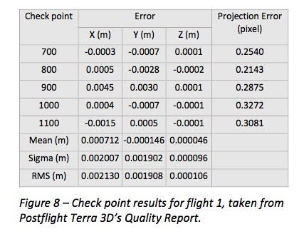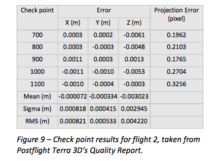 The first eXom survey (figure 8) achieved 2.1 millimeter accuracy in X, 1.9 millimeter in Y and 0.1 millimeter in Z (RMSE). The second eXom survey (figure 9) achieved 0.8 millimeter (X), 0.5 millimeter (Y) and 4.2 millimeter (Z).