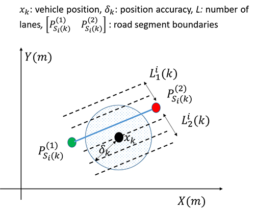 A geometric illustration of the problem is shown in Figure 3. The road-network map is represented as a set of connected segments. Each road segment is defined by a straight line segment with a start position and end position. Curved roads are approximated by a sufficiently large number of straight line segments. Based on this notation and geometric illustration, the estimation problem that this article is addressing is the determination of the lane on which the vehicle is moving.