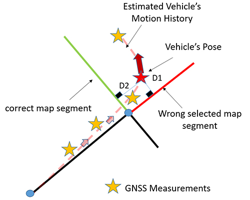 Map-Matching with Hidden-Markov Model. The simplest map-matching method, point-to-curve-matching, is performed by searching for the nearest road segments within a threshold from the current vehicle’s position. The distance is calculated between the vehicle’s position and its projection on the map segment. However, this approach is sensitive to state estimation errors, and it fails at intersections, joins, branches or dense parallel roads. For example, Figure 4 shows a situation where biased GNSS position measurements exist, and the wrong map segment is selected because of the pure dependence on the distance metric only (for instance, D1 is less than D2).