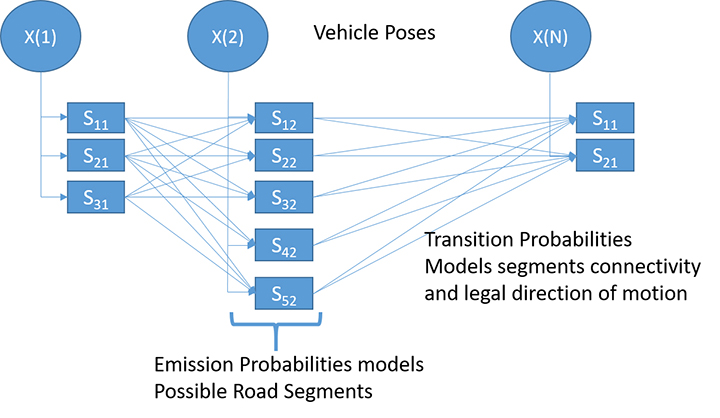 This estimation process, called decoding, is solved using the Viterbi algorithm. In the proposed system, the hidden states represent map links, and the observable outputs are the vehicle poses. To develop a robust map-matching framework, the vehicle pose history, roads geometry, and map topology constraints must be considered. Therefore, the emission and transition probabilities of an HMM are formulated such that they reflect all of these constraints. The Bayesian network of the HMM for our system is shown in Figure 5. The vehicle states (poses) is obtained from the INS/GNSS filter described shortly.