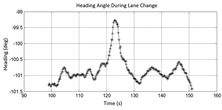 FIGURE 6. Vehicle’s heading during lane change to left. (Figure: Mohamed M. Atia and Allaa Hilal)
