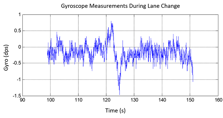 FIGURE 7. Vehicle’s gyroscope measurements during lane change to left. (Figure: Mohamed M. Atia and Allaa Hilal)