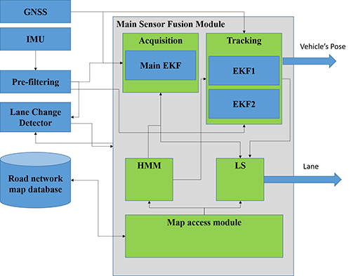 Tracking Phase. Two EKF filters are initiated. One EKF accepts position updates from the projection of the vehicle’s position on the selected lane, and the other EKF accepts GNSS position updates only. A discrepancy measure is evaluated between the two EKF instances for a short window of time. If this discrepancy measure is higher than a threshold, a temporary GNSS deviation is assumed and the system keeps reporting the current lane as the designated lane. If GNSS measurements started to be centered again on the new lane, a lane change is confirmed and the output of the first EKF instance will be the correct state. Otherwise, this lane change is declared as false and the second EKF output is the correct output. The overall block diagram of the proposed system is shown in Figure 8.