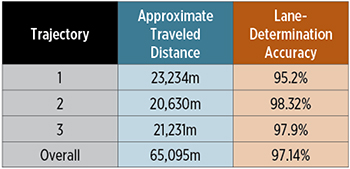 Lane-Determination Results. The lane estimation results were logged and time-tagged. Using the video recording, the ground truth lane-level solution was visually inspected and manually recorded in a file. Since both the video camera and the proposed INS/GNSS/maps systems log data tagged by GPS time, synchronization between ground truth and the estimated lane were possible. The estimated lanes were visually inspected record by record and results were saved in an Excel sheet. The results were written into a time-tagged file where each row can be easily visually inspected by looking at the portion of images corresponding to the same time-tag. The time-tag used was the UTC-time contained in the NMEA GNSS raw measurements. The overall accuracy of the proposed system in lane determination is shown in Table 3.