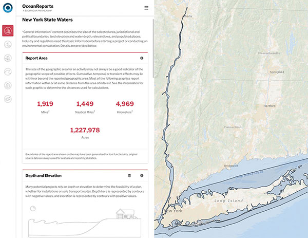 The OceanReports web tool provides users with specialized “ocean neighborhood analyses,” including maps and graphics, by analyzing more than 100 ocean datasets instantaneously. Reporting data includes information about habitats and species, industries in the area, potential hazards (such as undersea cables or shipwrecks), the economic value of ocean commerce, and other detailed oceanographic information. The web-based interactive tool for ocean mapping and planning, created by the National Oceanic and Atmospheric Administration (NOAA) and the Department of the Interior’s Bureau of Ocean Energy Management, provides professional users and the general public with opportunities to explore the ocean from their own computer.