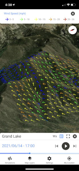 WindNinja is a high-resolution wind modeling app created for firefighters who need to quickly compute and visualize wind direction and speed simulations. The simulations provide them with situational awareness, help keep them safe, and help them conduct work such as burnout operations. The mobile app, developed using ArcGIS AppStudio from Esri, provides high-resolution, near-surface wind forecasts that include wind speeds and directions displayed on a map. The user selects an area of interest of 50 square kilometers or less, names the simulation, chooses a forecast duration of up to 15 hours, selects whether to receive an email or SMS notification when the simulation is ready to view, and then submits the request. The user also can select from a variety of basemaps and turn on data layers — vegetation, atmospheric, oceanic, land-surface imagery — collected by NOAA satellites.
