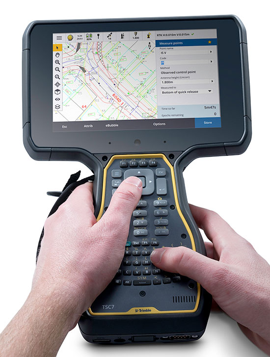 The Trimble TSC7 controller is a new field solution for land and civil construction surveyors. Equipped with GPS, it provides a tablet experience with a physical keyboard and a sunlight-readable 7-inch touchscreen that supports pinch, tap and slide gestures. Front- and rear-facing cameras allow users to video conference their office from the field for on-the-job support, and capture high-definition videos and images that provide valuable context to their data and clients. The TSC7 uses Windows 10 Professional with an Intel Pentium 64-bit quad-core processor. The processor and operating system make it easy to process data in spreadsheets and run office software programs. An ergonomic form factor, IP68-certified rugged design and optional, user-interchangeable modules make the TSC7 a flexible solution for all surveying applications.