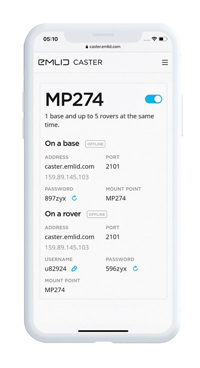 Emlid Caster is an easy way to transmit corrections between real-time kinematic (RTK)-capable devices via the internet. Emlid Caster has a simple interface. Users can create their personal mount point and connect one base and up to five rovers. It works not only with Emlid products but any other device supporting NTRIP. For example, users can pass RTK corrections to the DJI Phantom 4 RTK drone from the Reach RS2 receiver as a base station. Emlid Caster is free and available worldwide. Once signed up, personal NTRIP credentials are generated automatically for a base and a rover.