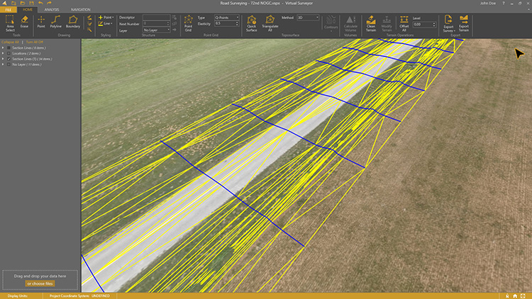 Drone surveying software Virtual Surveyor now eliminates the need for clients to use third-party applications to prepare data for processing. Version 6.1 handles on-the-fly projections that previously required a separate software package to set the data in the proper coordinate system. It bridges the gap between UAV photogrammetric processing applications and engineering computer-aided design (CAD) packages. The software generates an interactive onscreen environment with UAV orthophotos and digital surface models where the surveyor selects survey points and breaklines to define the topography, creating highly accurate topographic products for CAD input up to five times faster than otherwise possible. Surveyors can drag and drop all kinds of files into Virtual Surveyor: points, raster, vectors and point clouds. The point clouds are converted to a DSM for manipulation and processing, dramatically accelerating the time required to generate the CAD model.