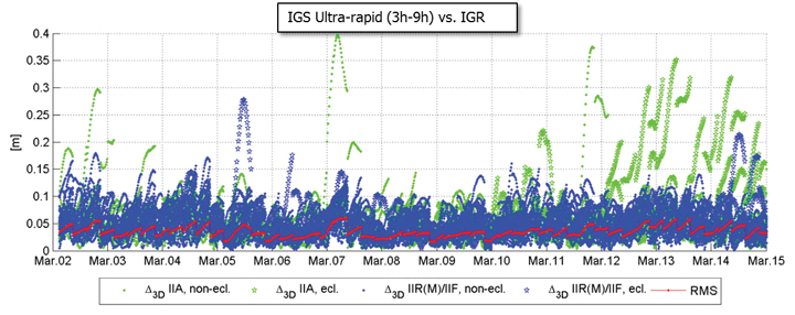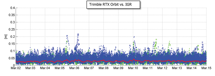There are at least two strong reasons for justifying the need of implementing and running an RTX proprietary orbit processing server. The first one is simply the need of reliably meeting the above-mentioned requirements. The second one is that from an operational perspective, the RTX system is conceived in such a way that it does not rely on any external source of information to run at its full accuracy capability. Figure 4 shows the achieved orbit errors provided by IGS ultra-rapid products during two weeks of March 2011, where IGS rapid orbit products are used as truth. The ultra-rapid orbits are evaluated using the initial portion of the predicted arc, thus making use of the most reliable part of the predicted arcs as the products become available in real-time. In that case, neither accuracy nor continuity requirements for RTX processing are completely met.