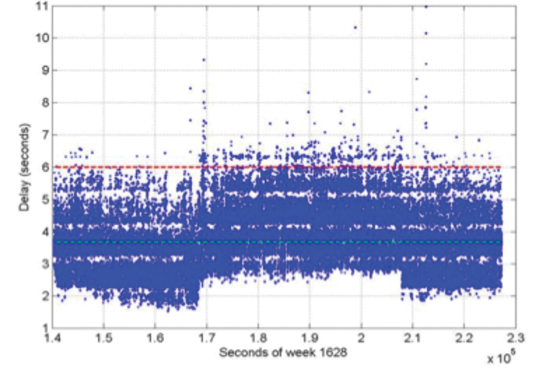 The RTX clock network processor was designed around the requirements discussed earlier. It computes clocks that are compatible with ambiguity resolution on the user receiver. As a matter of fact, the clock network processor itself employs ambiguity resolution for the generation of the RTX clocks. The processor architecture is based on an innovative design that allows processing data of several hundreds of reference stations, including all necessary steps such as data quality control, ambiguity resolution, and the final clock generation, within a fraction of second. The processing time of this kind of real-time network processor has to be minimized as much as possible in order to allow the processor to operate at 1 Hz, and to minimize the final correction latency at the rover end. Note that the final latency of the correction stream is a composition of three basic components: the time for the network data to arrive at the network processing server; the network processing time; and the correction transmission time to reach the final user. Figure 6 shows the typical total correction latency for the RTX system, when corrections are broadcast through a satellite link.