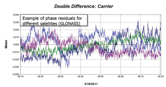 Unlike satellite orbits, satellite clock solutions are more difficult to compare directly. This is because different clock solutions might have offsets between each other, as well as behave differently due to differences in their GNSS reference time realization process as well as in their observation modeling approaches. That said, one way of verifying the quality of satellite clocks is to quantify how well it can be used to model actual receiver observation data. This can be in general achieved by applying satellite orbit and clock correction onto GNSS data and verifying the remaining residuals. Other quantities such as receiver coordinates have to hold their correct values for the residuals to be meaningful. In this case, the combined satellite orbit and clock error are assessed, and not just the satellite clock alone. For our purposes this is perfectly fine, since this is the way orbits and clocks are employed in rover positioning as well. Figures 7 and 8 show typical combined satellite orbit and clock errors at line-of-sight for different satellites. Figure 7 shows the ionospheric-free phase modeling error for GPS satellites, while Figure 8 is for GLONASS. Note that observations of a reference satellite (highest elevation at the time of observation) were reduced from the others. This was done in order to remove the receiver clock errors from the residuals. For both GPS and GLONASS cases, the observation modeling error after using RTX orbit and clock corrections is on average at the 1 cm level, with values typically less than 2 cm. The GPS satellite with outlying behavior in the plot below was setting at that time, and the increased amplitude of the residuals is mostly due to receiver observation errors such as multipath.