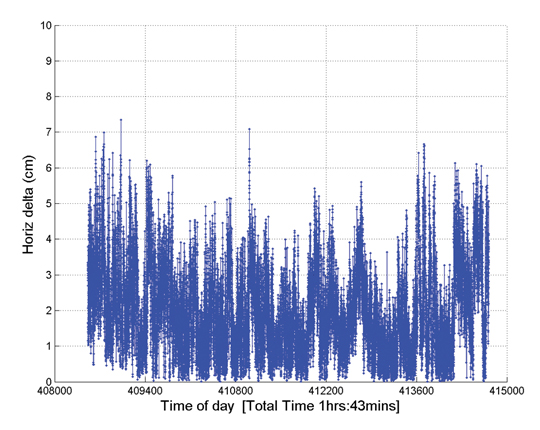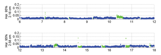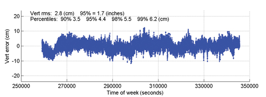 Figure 10 shows the vertical performance for the same receiver and time period: the vertical RMS was 2.8 cm, with 95 percent vertical error of 4.4 cm.