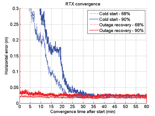 As the figure shows, the RTX system converged to better than 5 cm horizontal error after 20 and 25 minutes for 68 percent and 90 percent of the runs, respectively. Convergence time is correlated with a number of aspects, including satellite geometry and multipath environment. Because of these variations, the claimed RTX convergence time is between 10 and 45 minutes for full accuracy achievement.