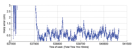The horizontal positioning performance for that field test can be seen Figure 16. The overall 2D RMS was 2.3 cm and the 95 percent horizontal error was 4.2 cm. Note that this position difference plot is between the RTX solution and a short-range single baseline (SBL) RTK solution providing truth. Therefore the numbers and plot actually show a combination of errors between the global RTX solution and the SBL solution to the local reference station.