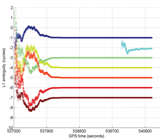 Figure 13 gives an example of Internet protocol (IP)-based RTX performance. This is a single run where the system converged to better than 5 cm (horizontal) in approximately 15 minutes. Figure 14 shows how the L1 ambiguities of individual satellites in view during that time converged.