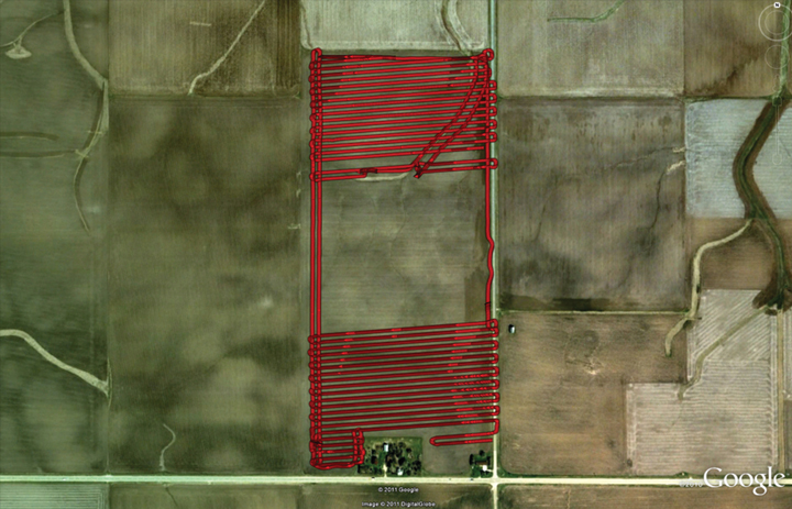 Optimizing the RTX system to work under different scenarios was necessary because the multipath and signal availability levels are reasonably different between running an antenna with a reference station setup and the actual user environment, where the data tracking conditions impose additional challenges on making high-accuracy positioning effective on a global basis, in a productive manner. Therefore, an extensive field test campaign was conducted during the pre-release phase of the RTX system. The next example shows RTX in-field performance for an precision agriculture application in Illinois. The setup is typical for agricultural use, with the antenna and receiver mounted on a tractor that ran for about 103 minutes. Figure 15 shows theactual track of the tractor; RTX corrections were received via satellite link.