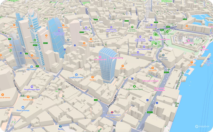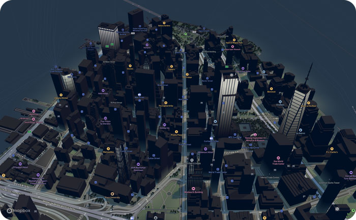 As part of Mapbox Standard, Mapbox has created a dataset of hundreds of recognizable landmarks across the globe, with more being added each month. The landmark buildings integrate seamlessly into the map environment and respond dynamically to lighting changes.