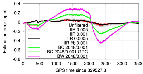 First, we compared results from improved temperature filtering to results from our earlier work. The performance of temperature measurement filtering is quantified with regard to frequency accuracy (mainly arising from filter group delay) and phase-lock indicator values of the tracked signals, which are mainly deteriorated from noise introduced by temperature compensation.